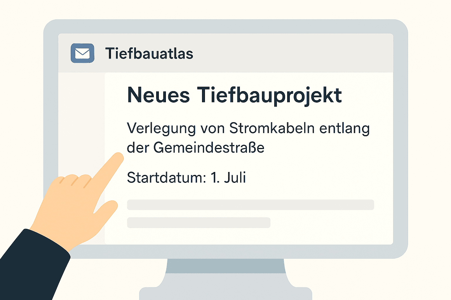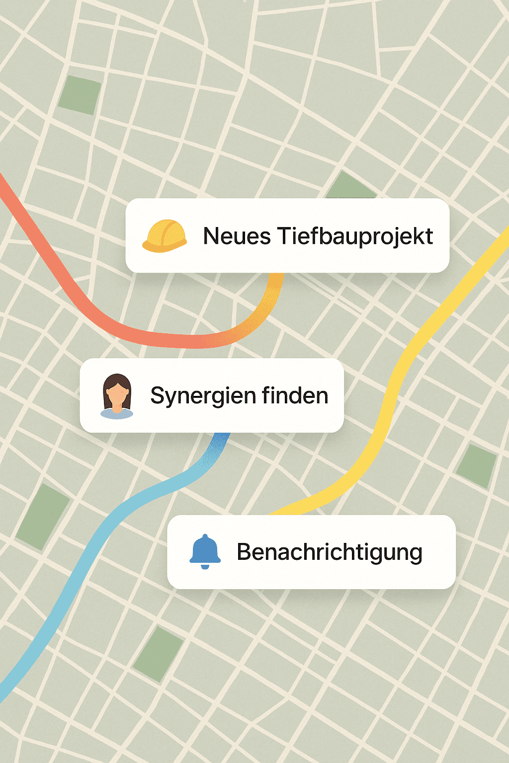 Der Tiefbauatlas ist eine digitale Plattform zur Koordination von Tiefbauprojekten. Gemeinden, Versorgungsunternehmen und Infrastrukturbetreiber können geplante Maßnahmen eintragen und erhalten automatisch Informationen über mögliche Synergien mit anderen Projekten in derselben Region.